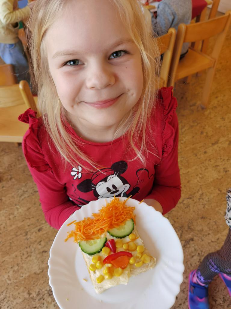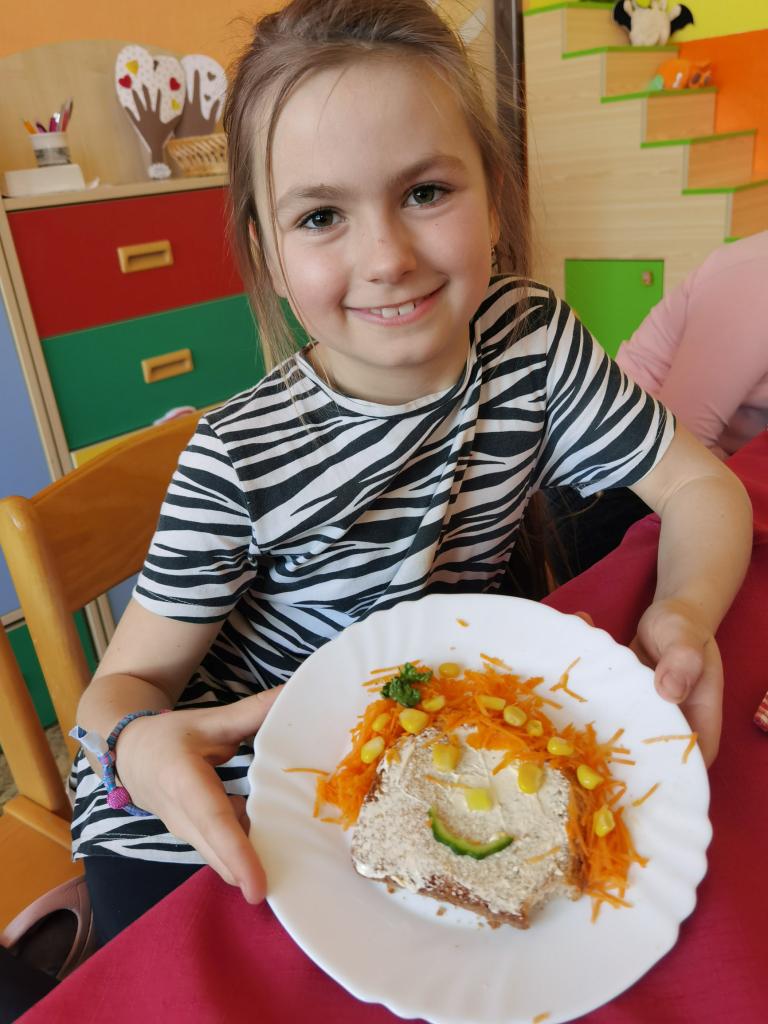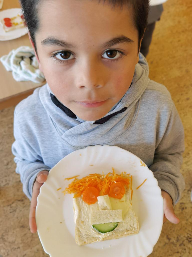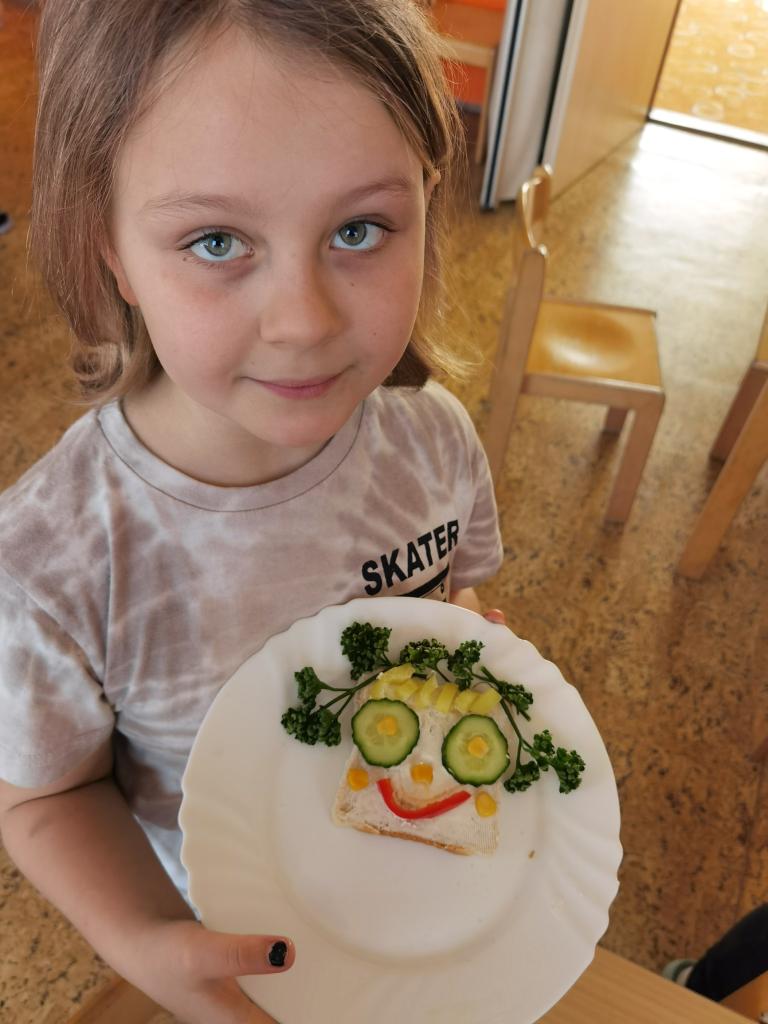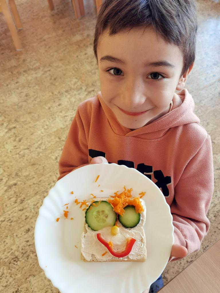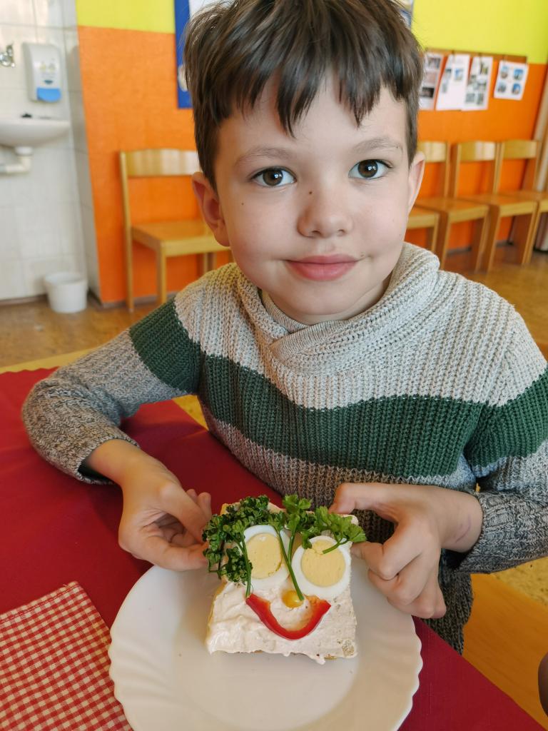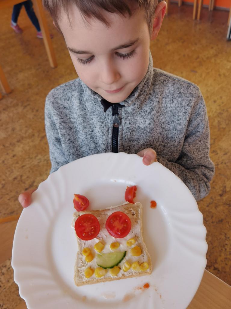 Děti si s nadšením připravily zdravé a veselé svačinky, které obsahovaly různé druhy chlebů, máslo, tvarohovou pomazánku a další ingredience jako pestrobarevnou zeleninu, sýr, šunku, vajíčka atd.Každý si vybral to, co mu chutná a po vytvoření si všichni užívali společné hodování u prostřeného stolu