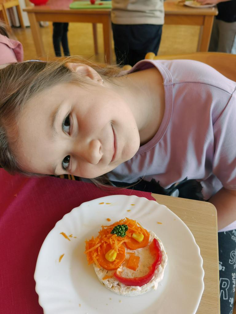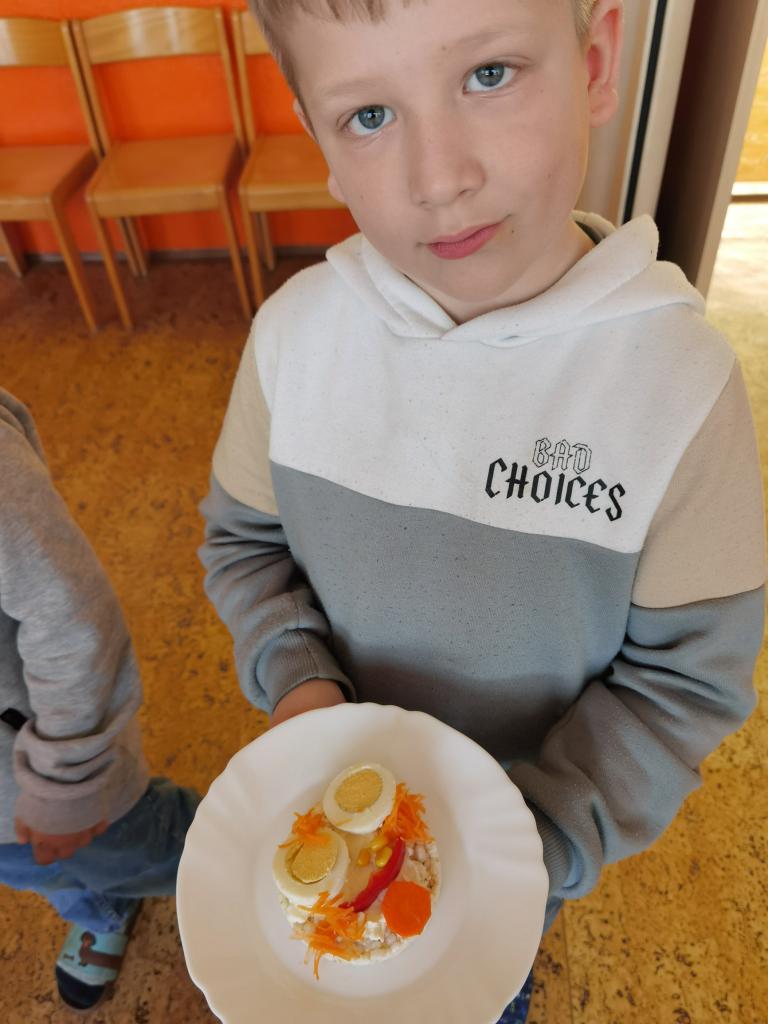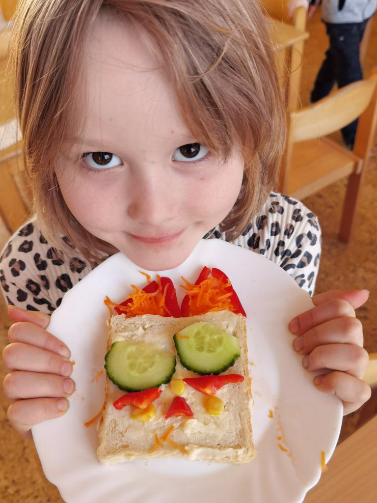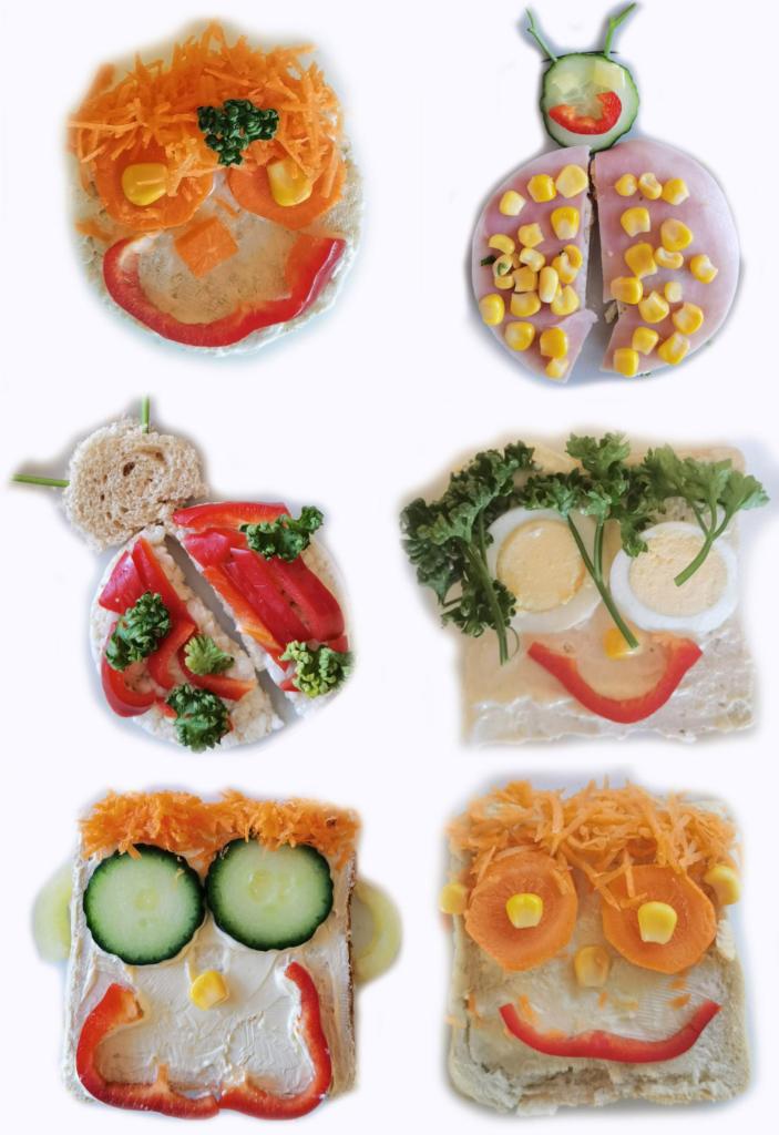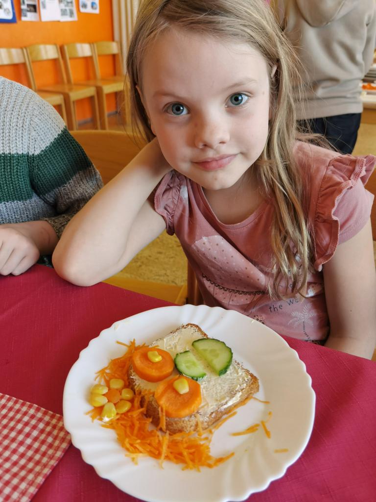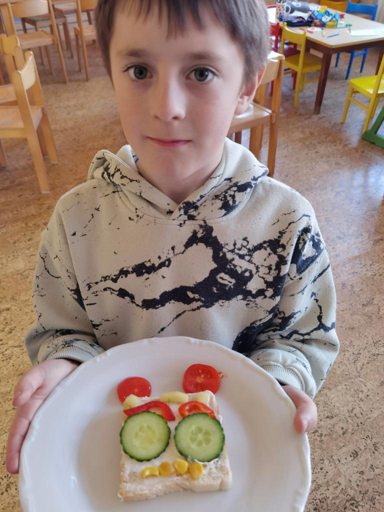 Děti si s nadšením připravily zdravé a veselé svačinky, které obsahovaly různé druhy chlebů, máslo, tvarohovou pomazánku a další ingredience jako pestrobarevnou zeleninu, sýr, šunku, vajíčka atd.Každý si vybral to, co mu chutná a po vytvoření si všichni užívali společné hodování u prostřeného stolu