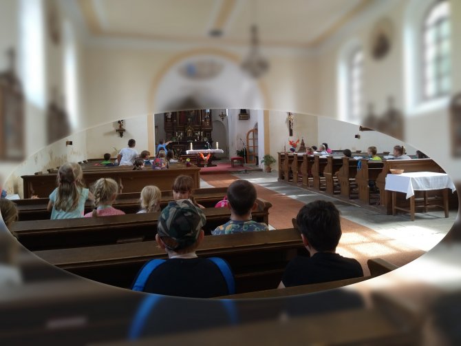 Díky panu Štaglovi jsme měli možnost vyšplhat po úzkém strmém schodišti až ke zvonu, který po zaťukání zvonivě zašeptal svou písničku. V kostele jsme se zaposlouchali do příběhu o dávné historii a nahlédli dokonce za oltář, kde se podle pověsti skrývá krabička se srdcem dávného knížete. Ve staré dřevěné skříni visely slavnostní ornáty, jejichž barvy prozrazují, k jakému účelu se používají. Návštěvu zakončilo očekávané opékání buřtíků na zahradě místní fary. Velmi děkujeme panu Štaglovi za báječné odpoledne plné pestrobarevných zážitků.