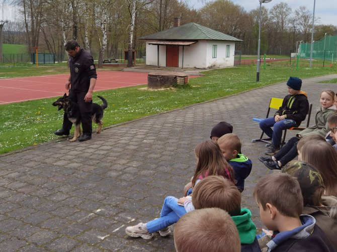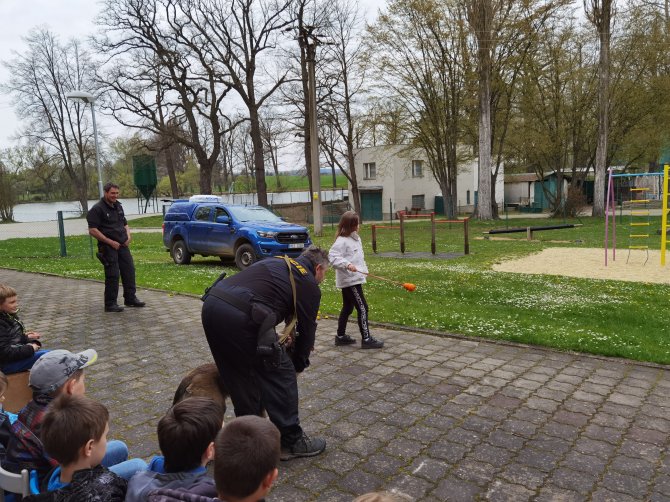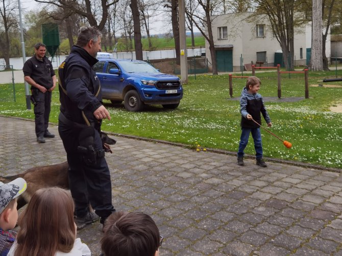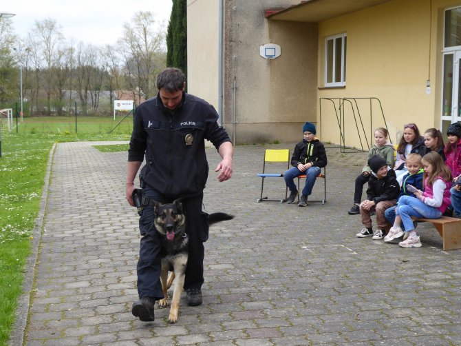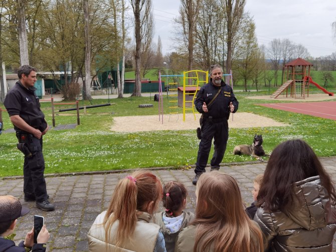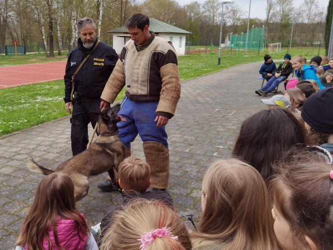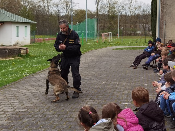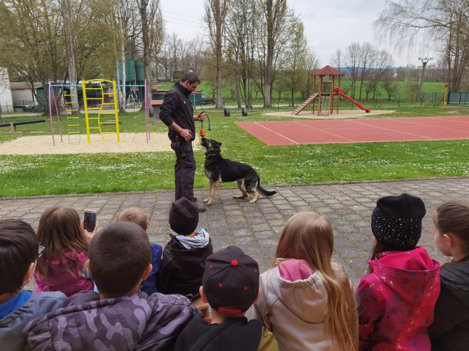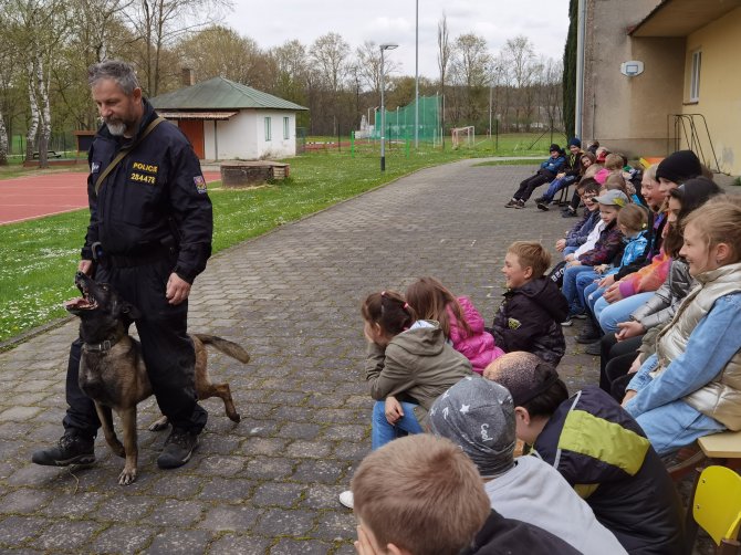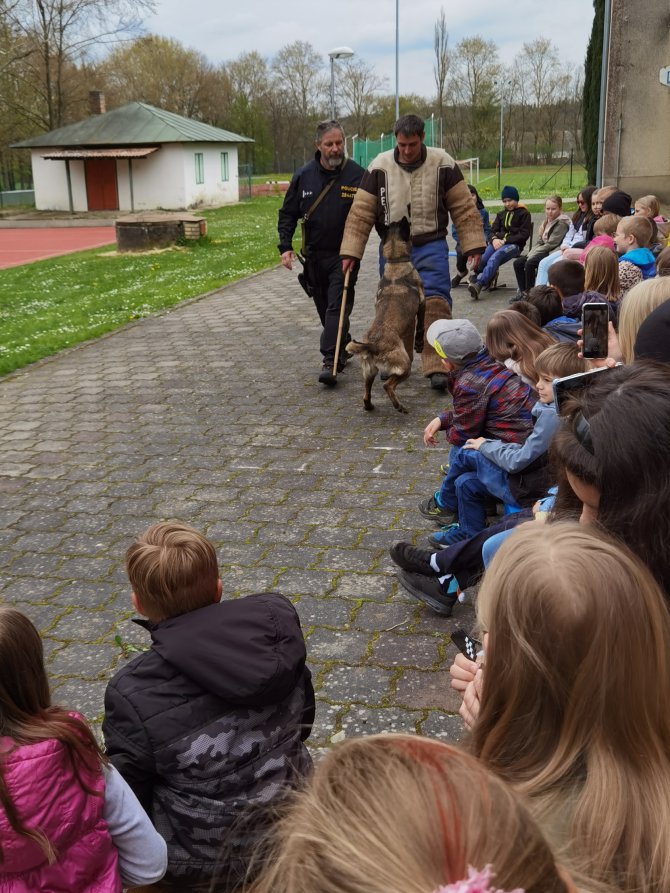 03.05.2023 "ouhelova" Na začátku května za námi do školy přijeli policejní psovodi se svými psími pomocníky. Vlastně pomocnicemi - představily se nám dvě fenky Góďa a Berga.