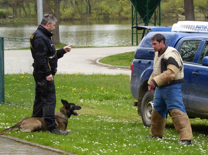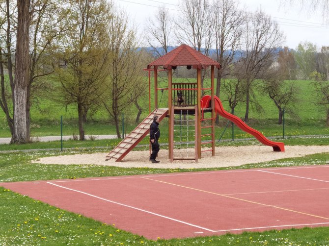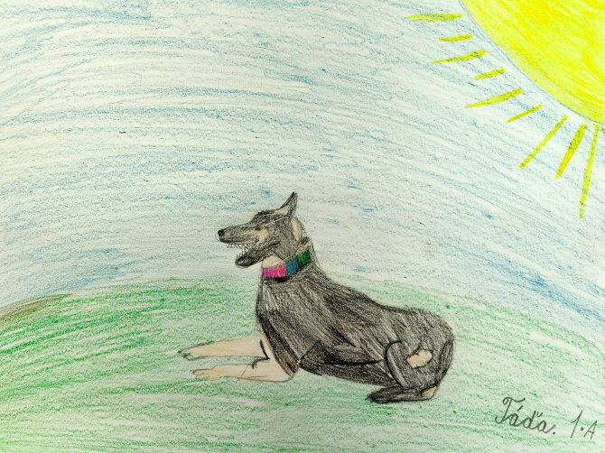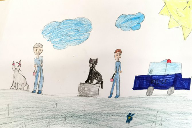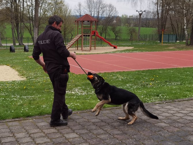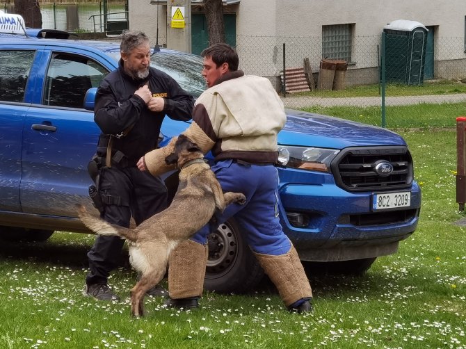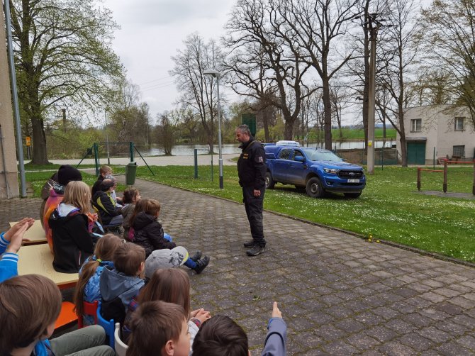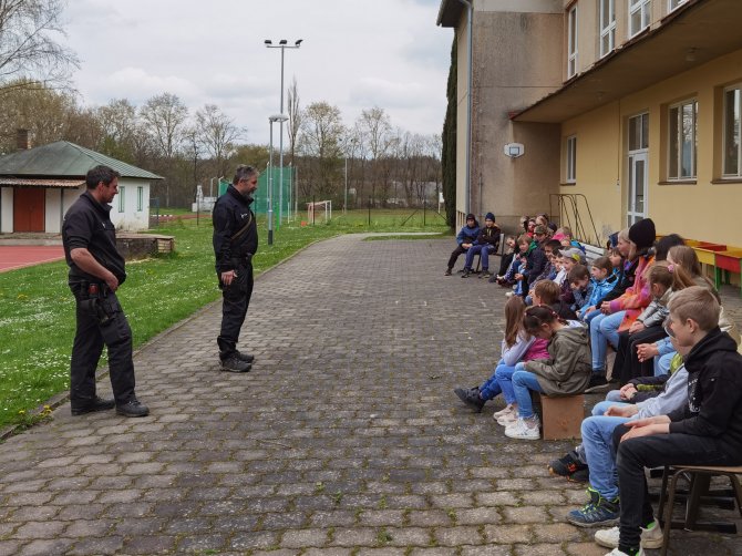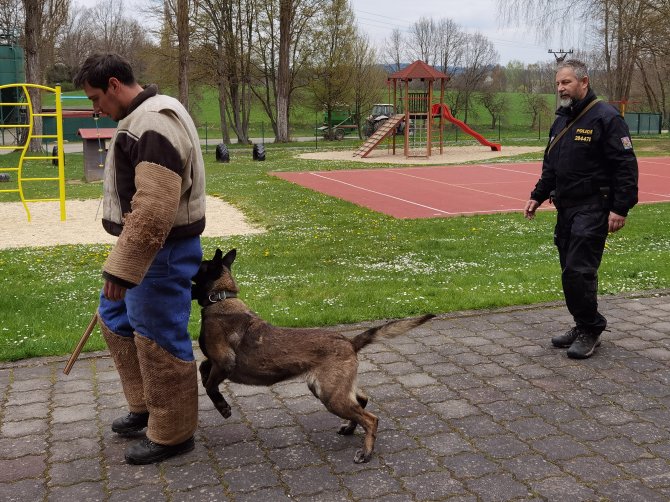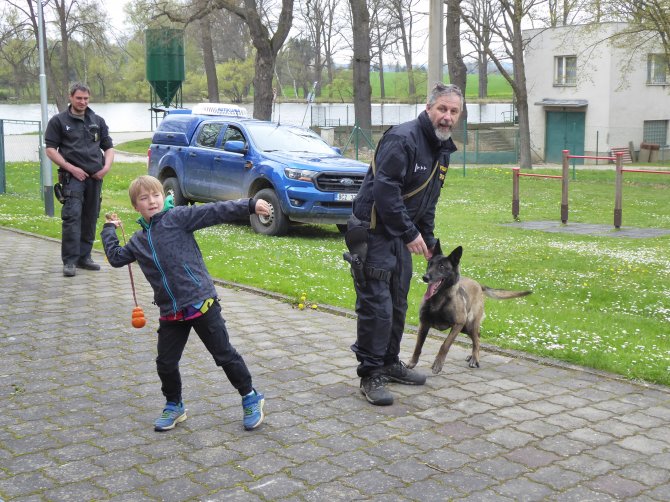03.05.2023 "ouhelova" Na začátku května za námi do školy přijeli policejní psovodi se svými psími pomocníky. Vlastně pomocnicemi - představily se nám dvě fenky Góďa a Berga.