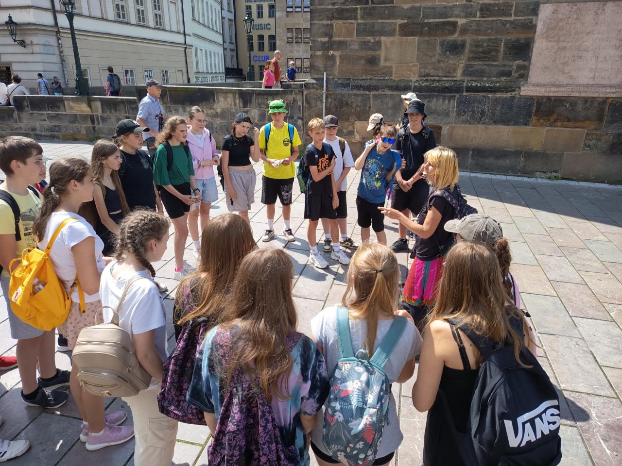 Po příjezdu na Hlavní nádraží jsme se přesunuli metrem na stanici Staroměstská a odtud pěšky na Křižovnické náměstí. Tam si nás převzala paní Dvořáčková z agentury Praha hravě a připravila pro nás zábavnou bojovku na Karlově mostě. Žáci byli rozděleni do pěti družstev a během plnění úkolů sbírali zlaťáky a diamanty.