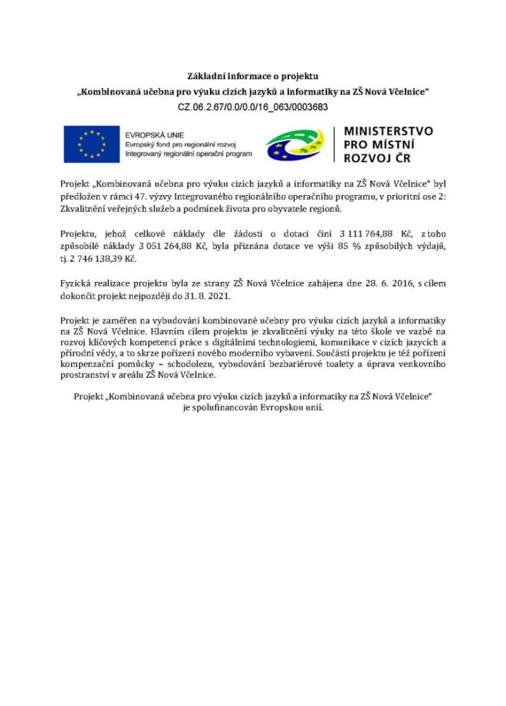 Projekt ,,Kombinovaná učebna pro výuku cizích jazyků a informatiky na ZŠ Nová Včelnice"